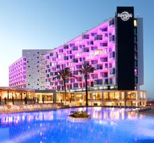 Situado en primera línea de playa en Playa d'en Bossa, el Hard Rock Hotel Ibiza es un hotel y complejo de lujo que ofrece alojamiento de lujo para los huéspedes. El hotel cuenta con más de 490 habitaciones y suites distribuidas en 8 plantas. Cada una de las habitaciones ofrece televisores de pantalla plana de alta definición, cortinas opacas para preparar té y café y un sofá cama o sillón con mesa lateral. Las suites mejoradas cuentan con salas de estar adicionales, comedores, camas redondas y vistas panorámicas al océano.
